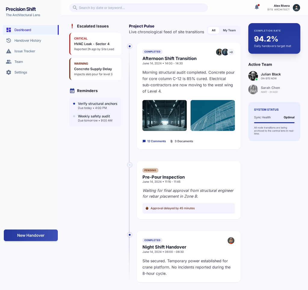 Digital shift handover system where teams log shift notes, issues, equipment status, and important information for the next shift. Searchable history, team notifications, and mobile access ensure nothing gets lost in transition.